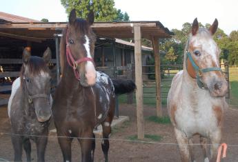 | Kokopelli (Big Red Racer ApHC#605046), is the gentle boy who is friend to all. He has been a wonderful "weaning coach" for the foals. In this photo, they are watching a new foal that was turned out for the first time. |